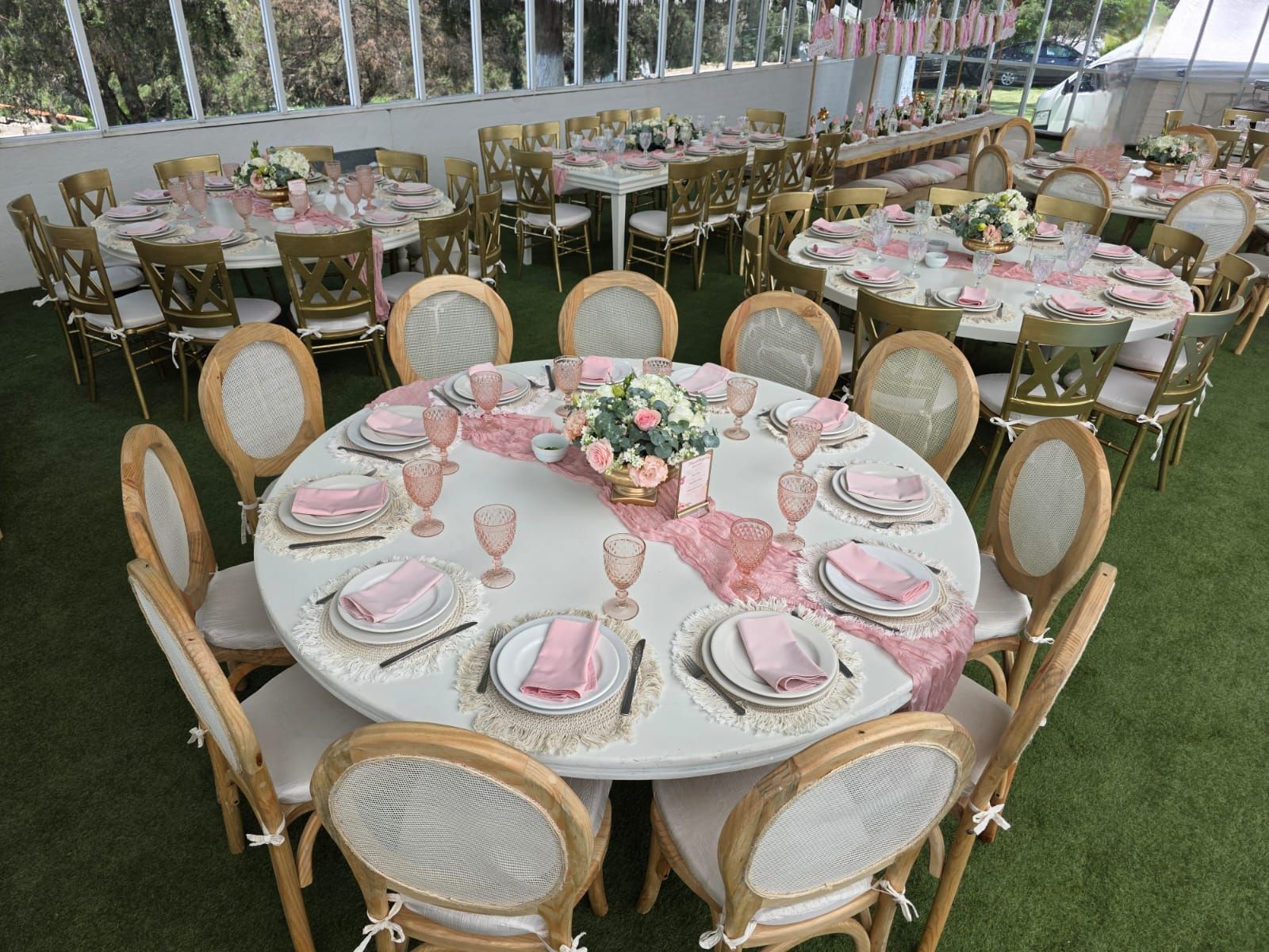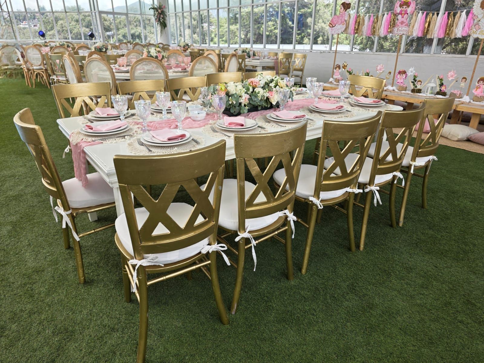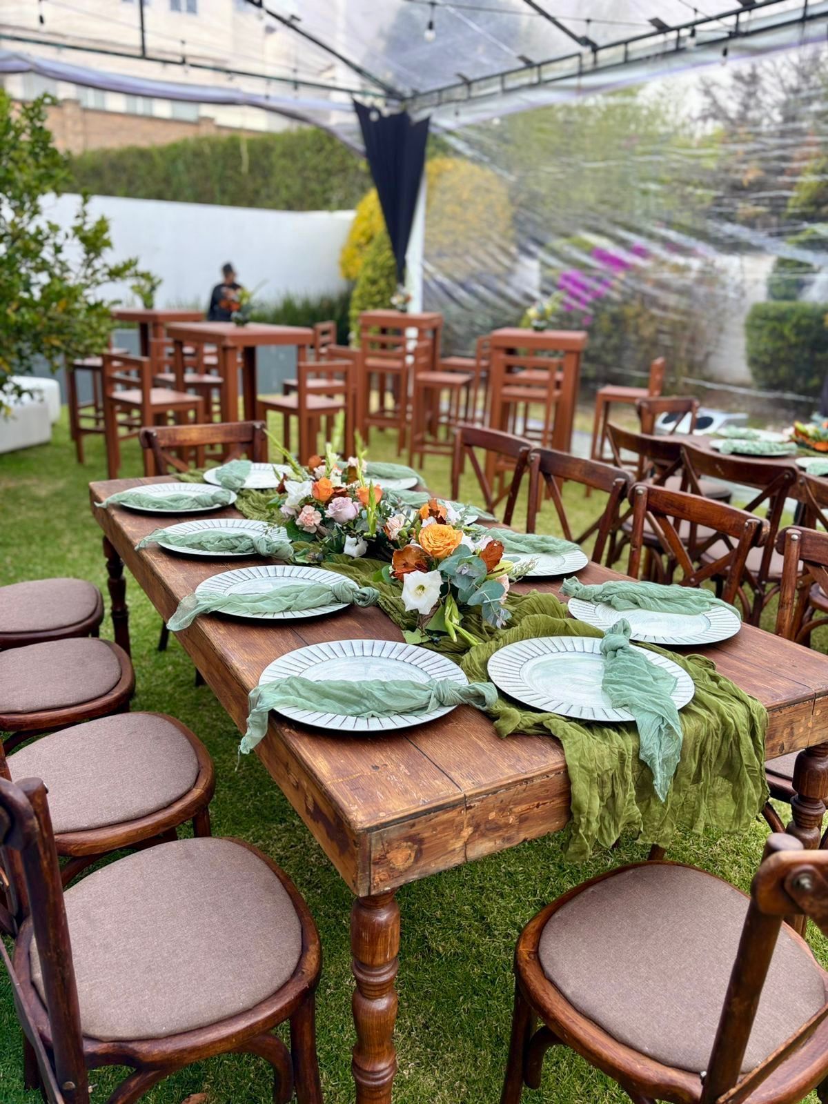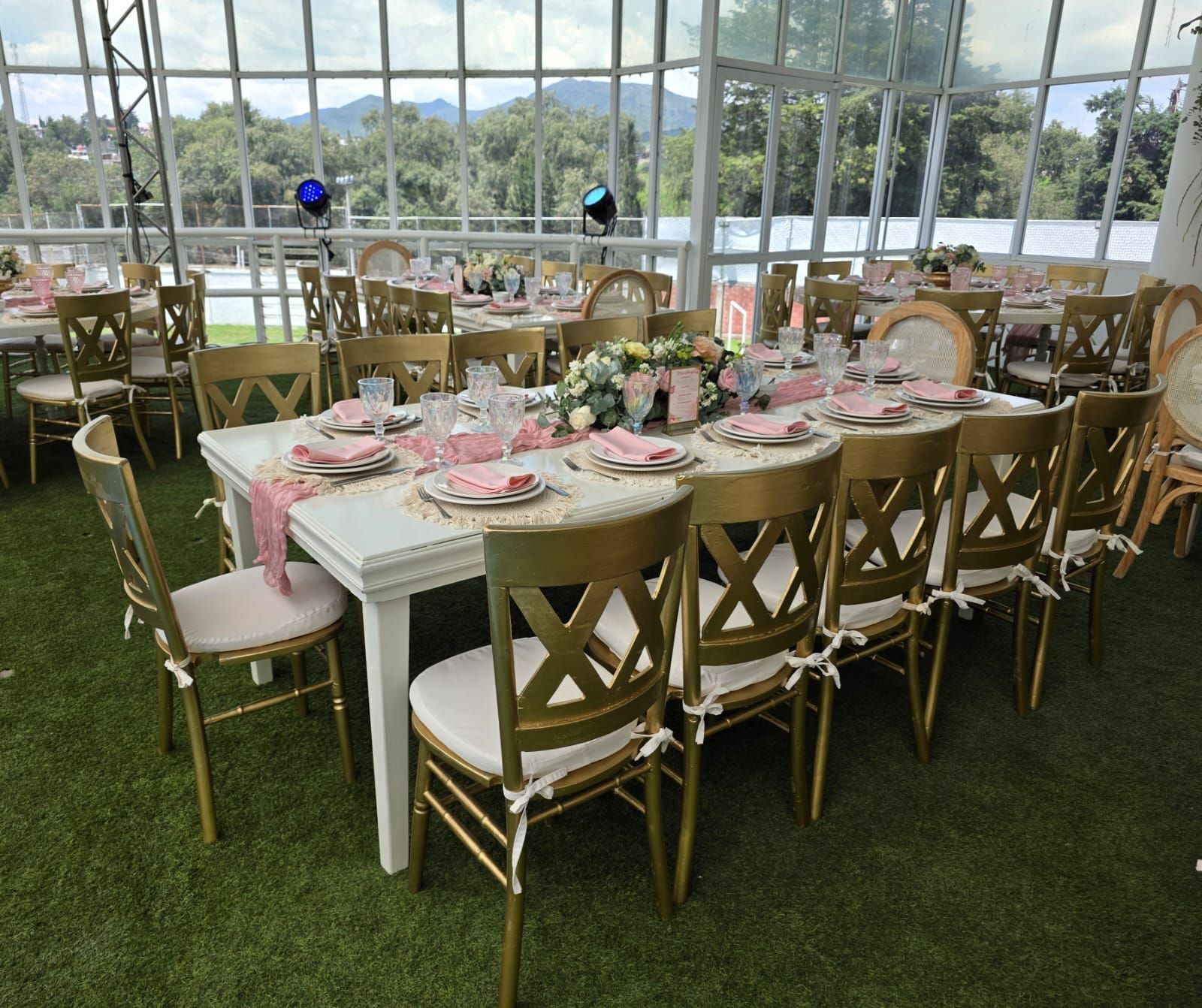 Mesas, sillas, mantelería, loza, cristalería y todo lo necesario.
