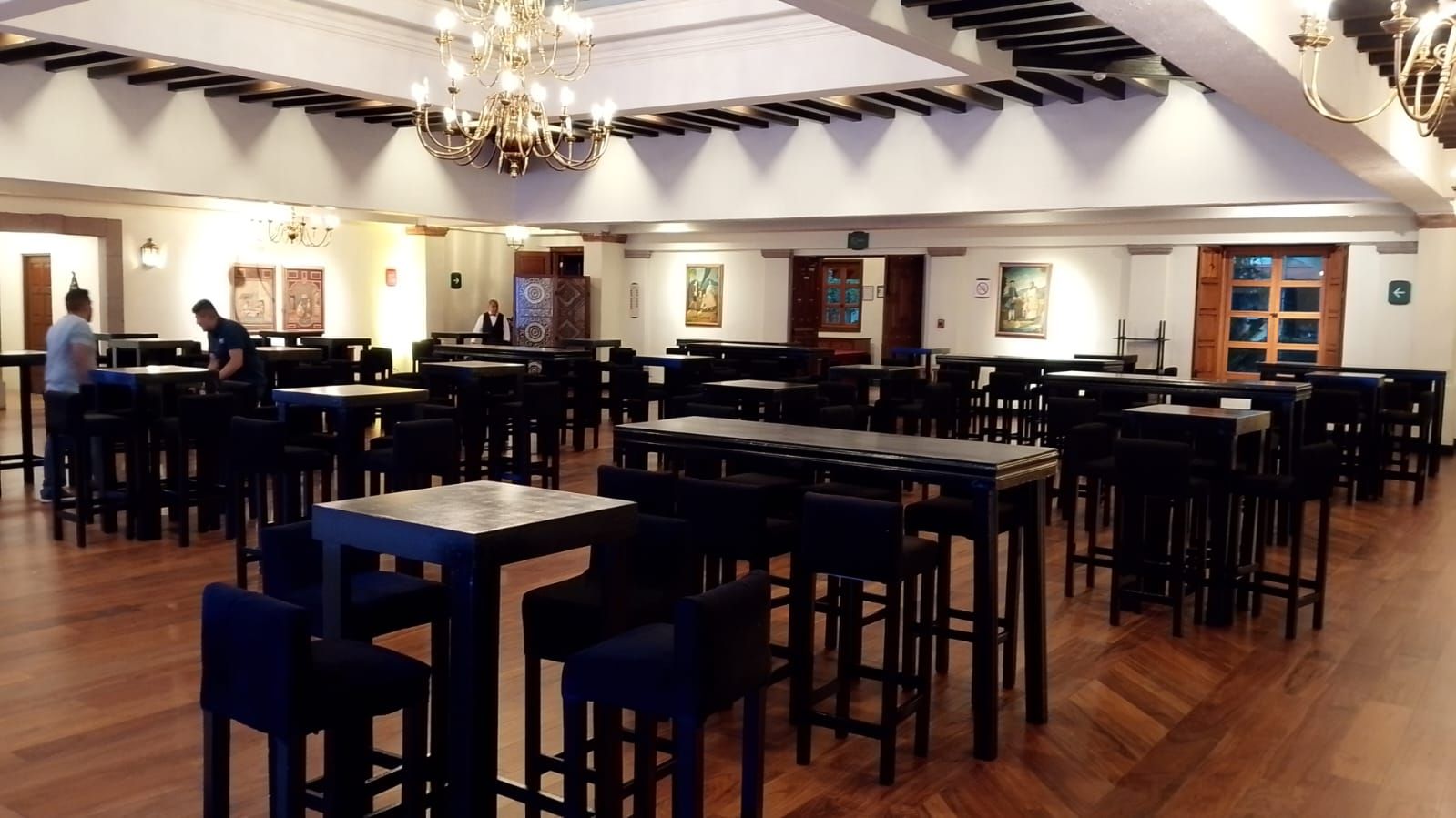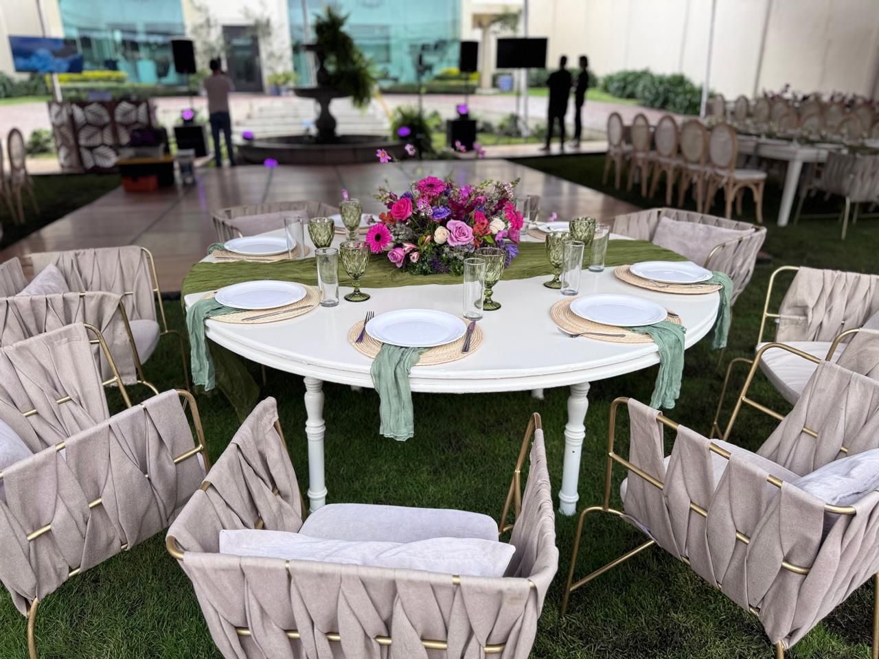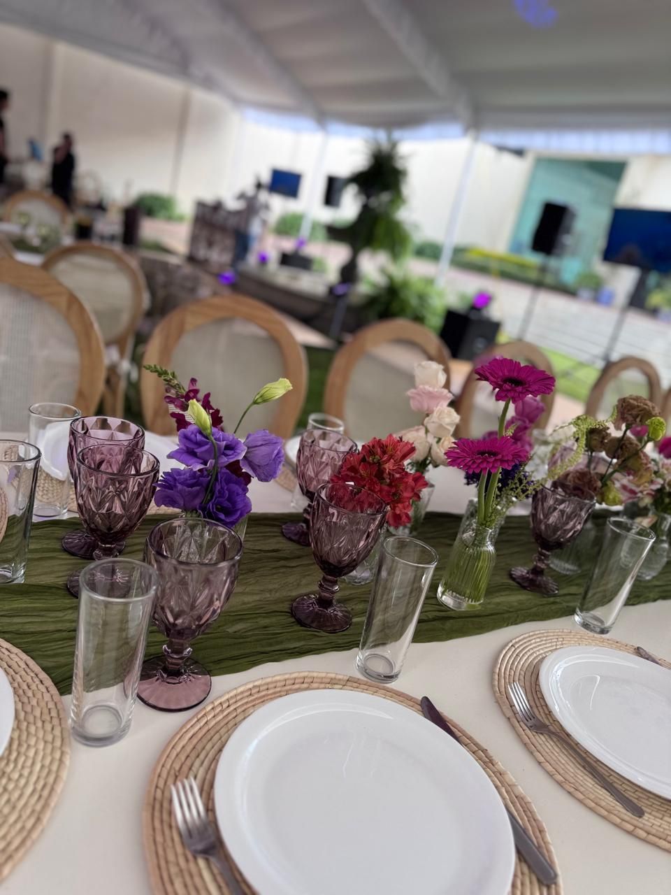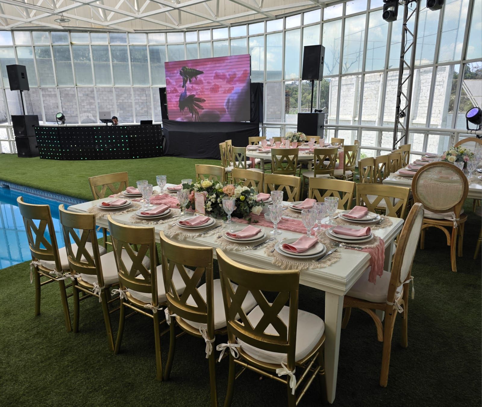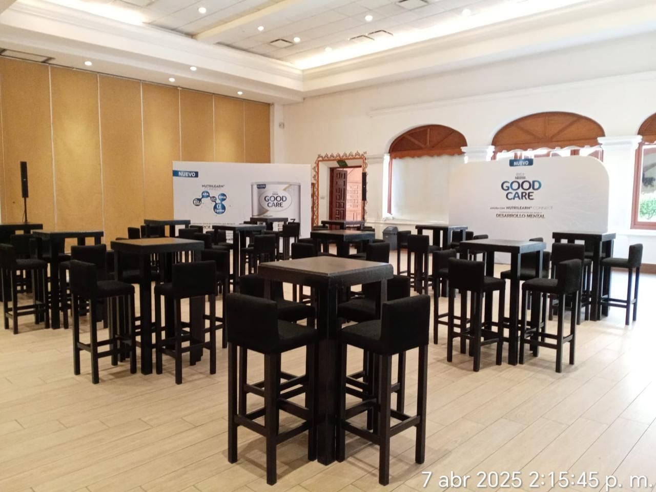 Mesas, sillas, mantelería, loza, cristalería y todo lo necesario.