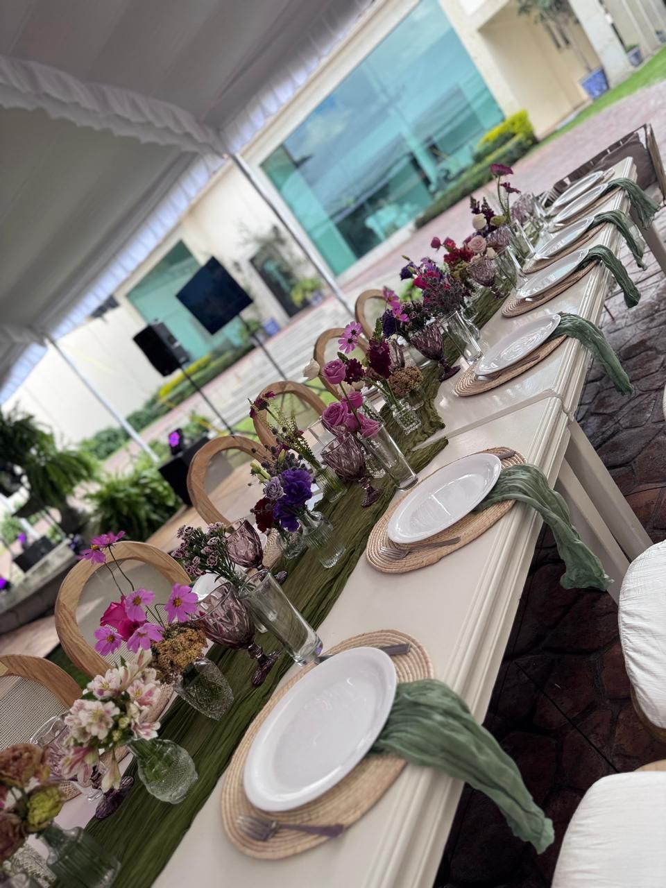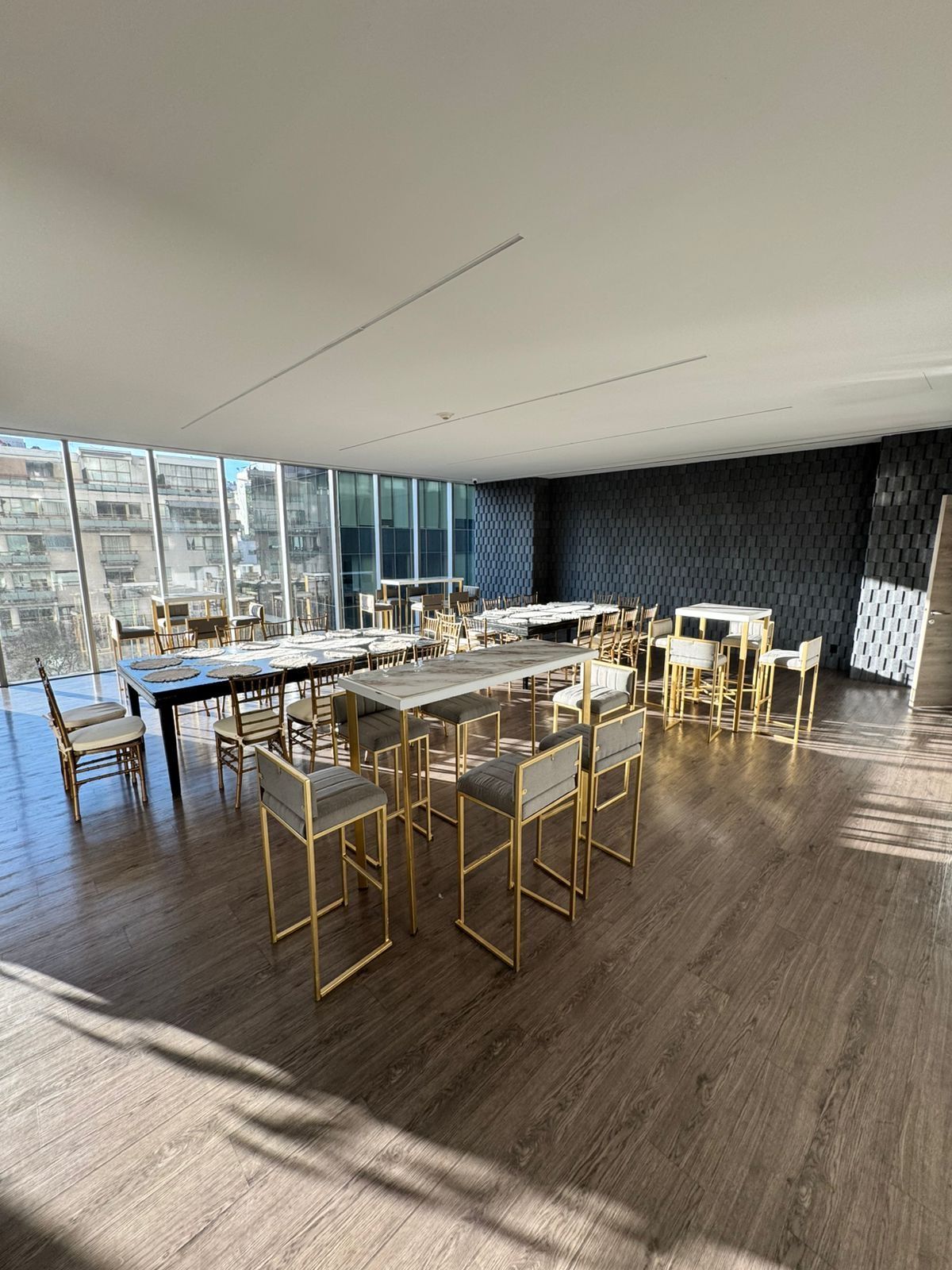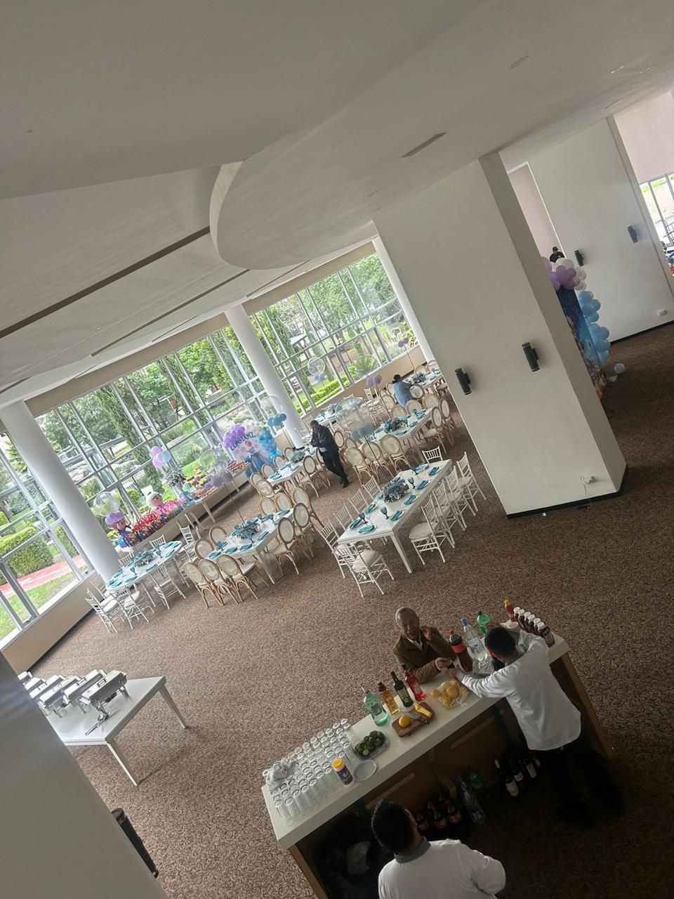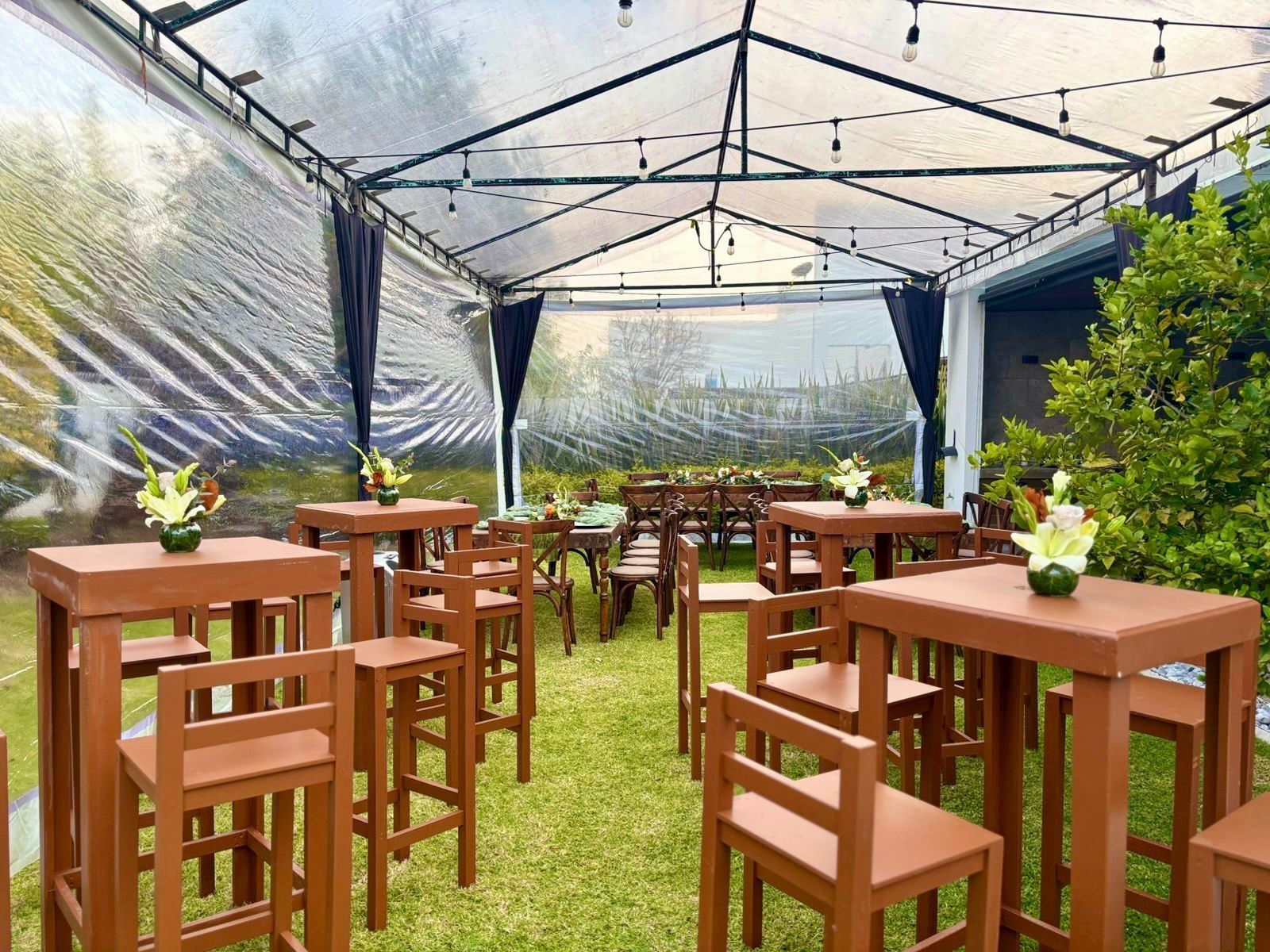 Mesas, sillas, mantelería, loza, cristalería y todo lo necesario.